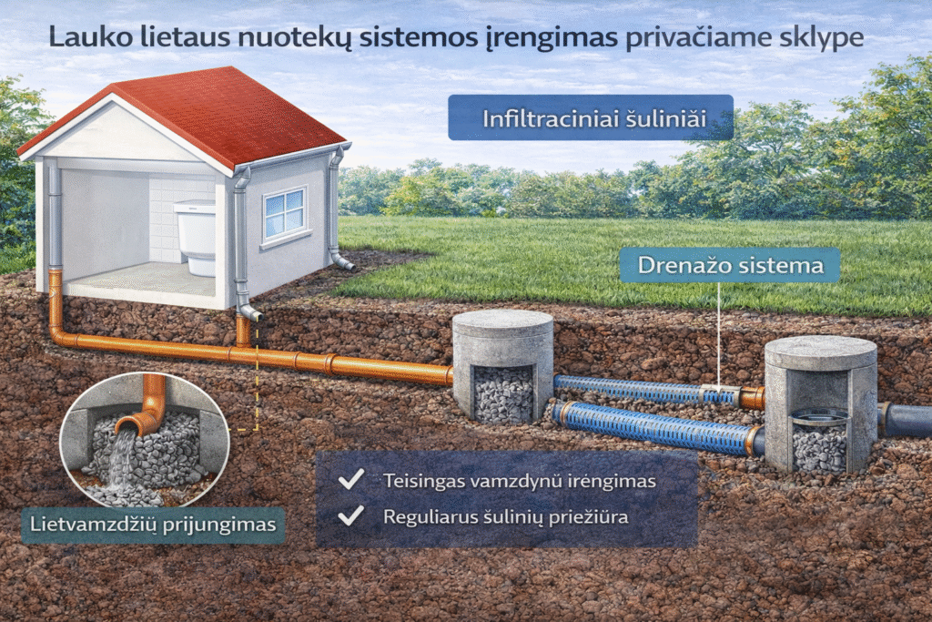 Lauko lietaus nuotekų sistemos įrengimas yra svarbi individualaus namo inžinerinių tinklų dalis, dažnai nepelnytai nuvertinama. Nors lietaus vanduo nėra naudojamas buityje, netinkamai suvaldytas jis gali sukelti rimtų problemų – nuo užmirkusio sklypo iki pažeistų pamatų. Todėl lietaus nuotekų sistemos turi būti planuojamos ir įrengiamos kartu su vandentiekio ir buitinių nuotekų sistemomis.