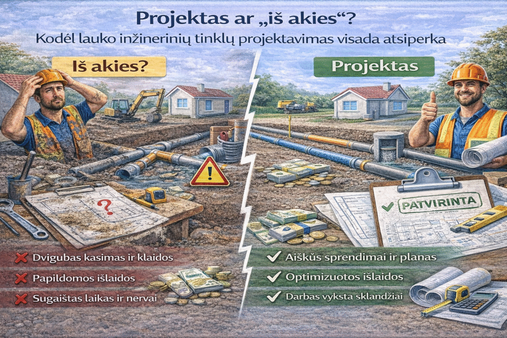 Lauko inžinerinių tinklų projektavimas nėra formalus reikalavimas ar papildoma našta. Tai sprendimas, kuris leidžia viską atlikti teisingai iš pirmo karto.Renkantis tarp „iš akies“ ir projekto, praktika rodo vieną aiškų dalyką – projektavimas visada atsiperka.